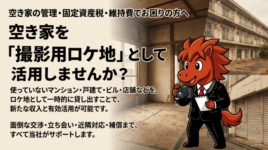 ロケ地として一時的に貸し出すことで、新たな収入と有効活用が可能です。