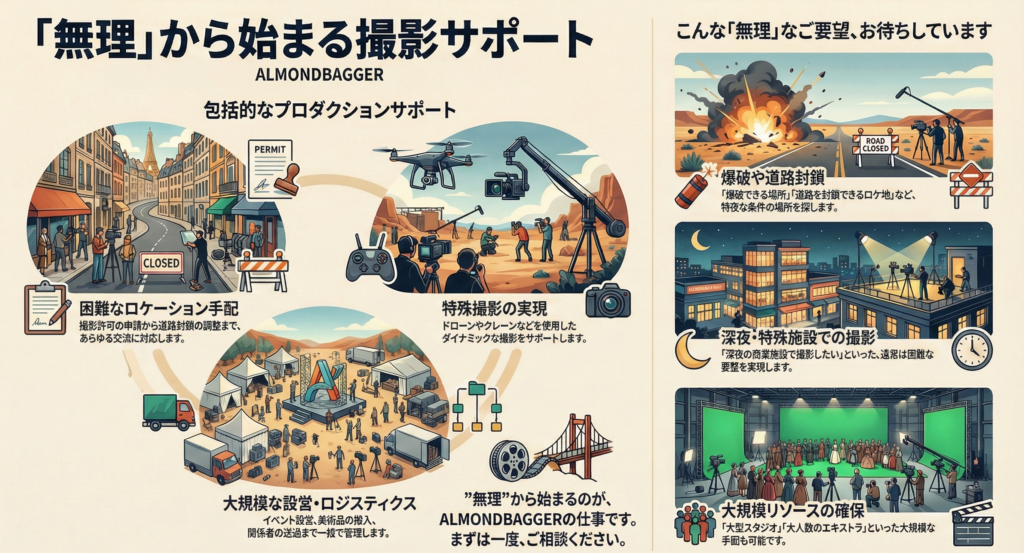 ALMONDBAGGERは、ドラマ・映画・配信作品、YouTube動画の現場で